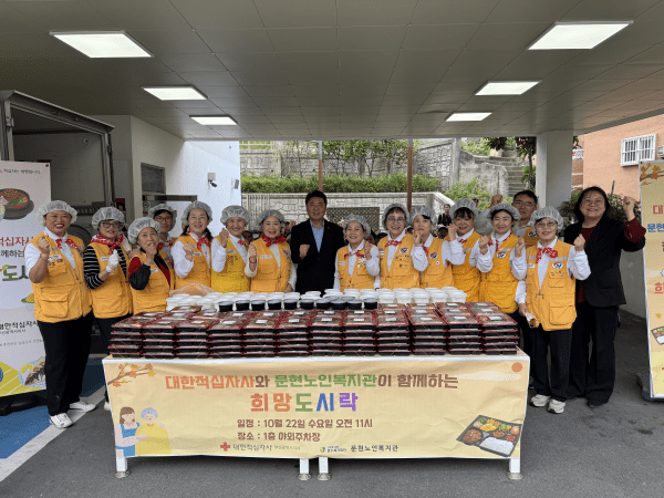 문현노인복지관(관장 변정희)은 지난 22일 대한적십자사 부산광역지사(회장 김정희)와 함께 2025년도 희망 도시락 나눔 행사를 열었다.